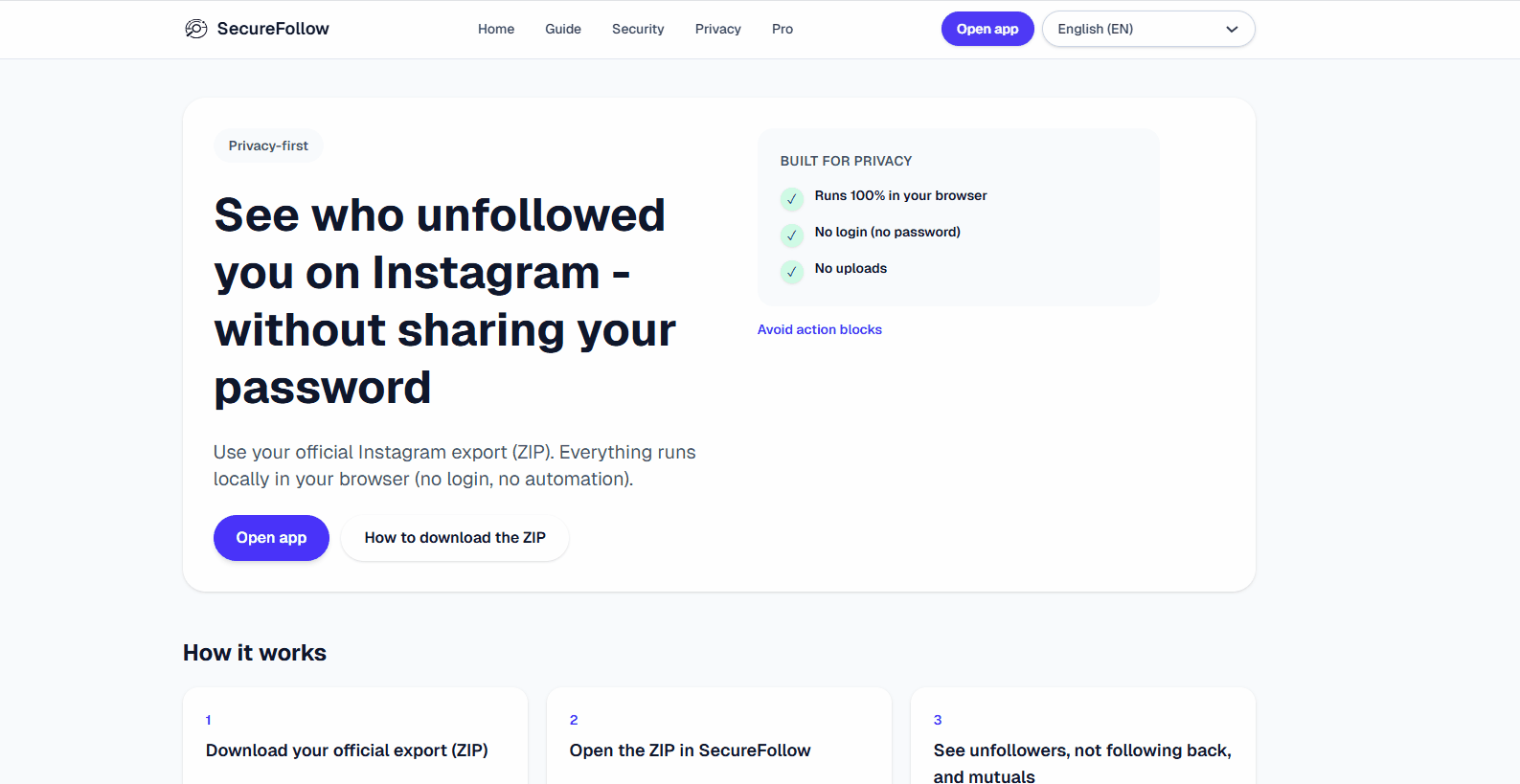 Your official Instagram export (ZIP) from Accounts Center, then open it in SecureFollow. See the download guide.