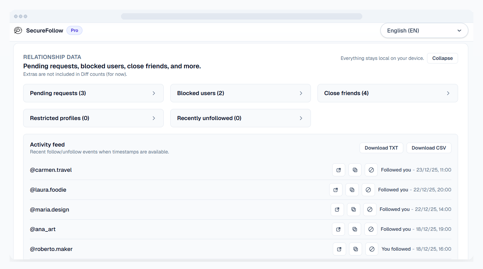 - Summary tiles for new followers and unfollows.