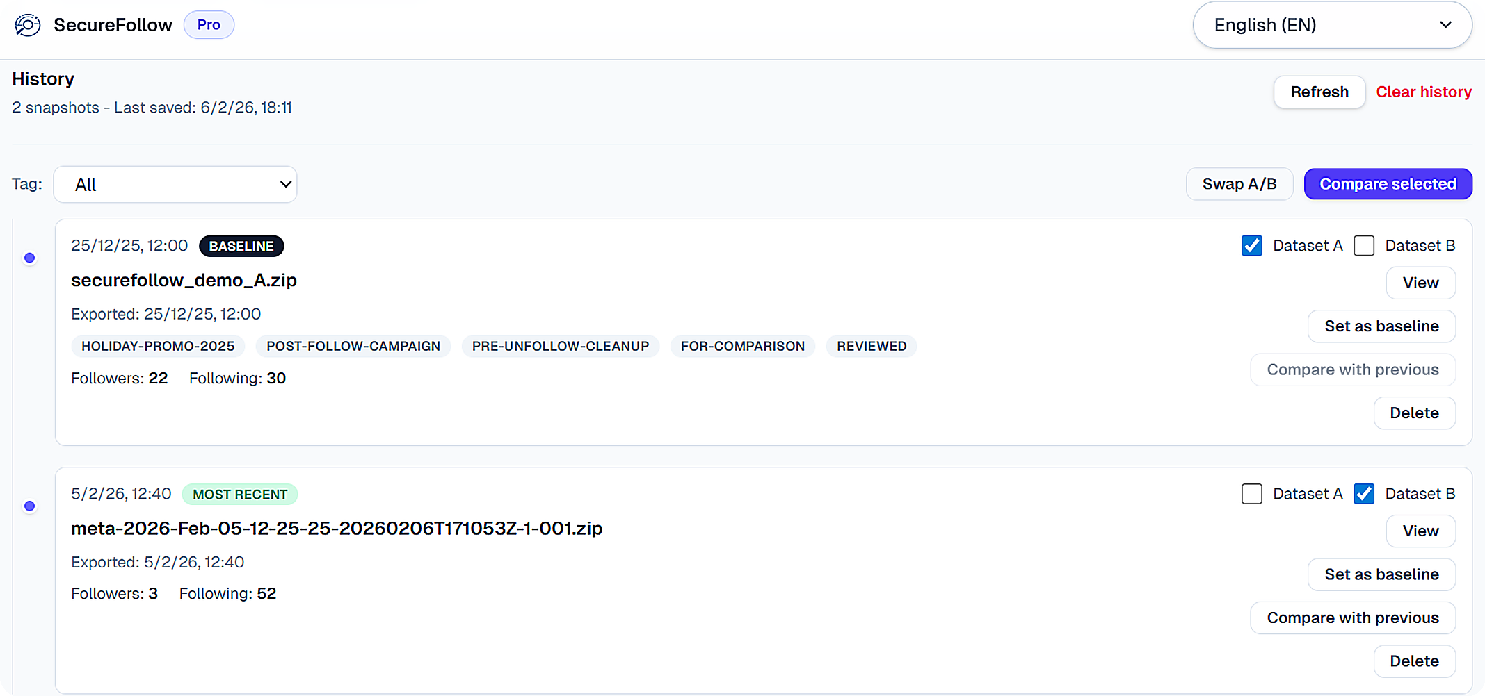 # SecureFollow - Snapshot Report - Date: 2026-02-07 - File: securefollow_demo_A.zip ## Totals - Followers: 22 - Following: 30 ## Derived - Mutuals: 18 - Not following back: 12 - You don't follow back: 4 ## Additional - Pending requests: 3 - Blocked users: 2 - Close friends: 4 - Restricted profiles: 0 - Recently unfollowed: 0 - Activity events: 52 Generated locally (offline).